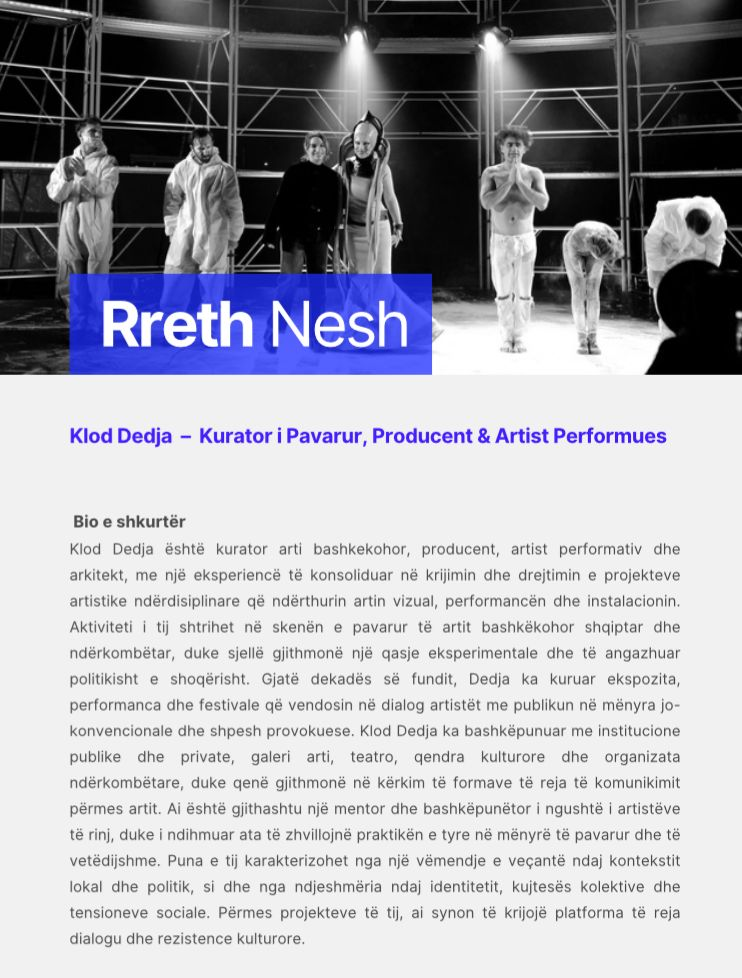 Më 11 korrik 2025, në arenën historike të Amfiteatrit të Durrësit, pritet të zhvillohet një nga ngjarjet më të veçanta kulturore të vitit, një shfaqje multidisiplinare e artit performativ bashkëkohor, e kuruar dhe prodhuar nga Klod Dedja, në bashkëpunim me Teatrin Kombëtar të Operas dhe Baletit (TKOB) dhe drejtorin e tij artistik, Edi Blloshmi.