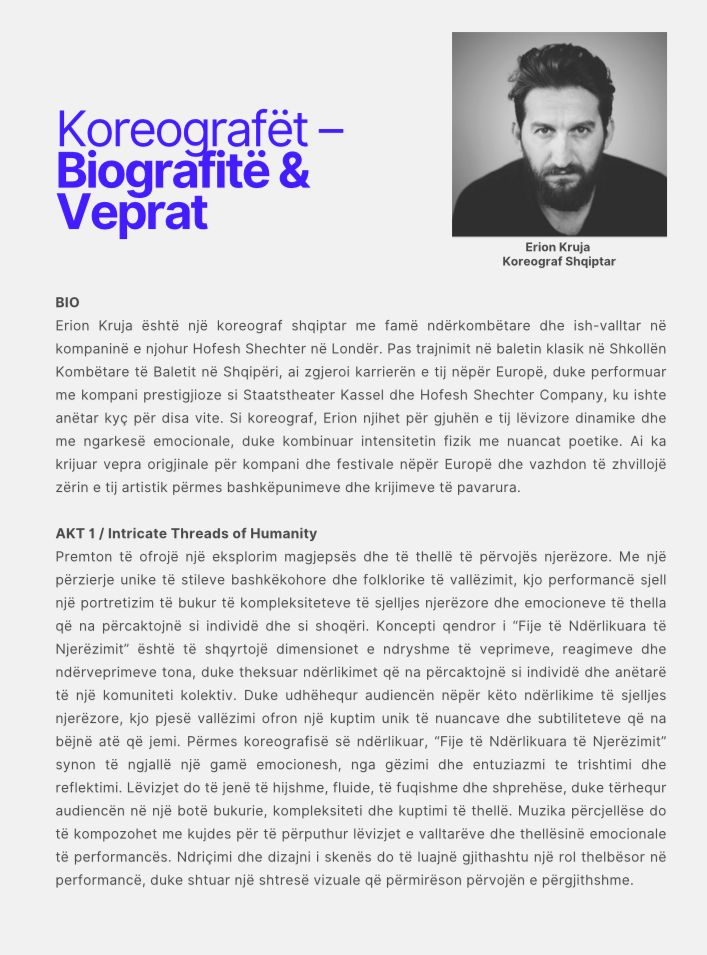 – “Intricate Threads of Humanity”, një koreografi e ndjeshme dhe filozofike nga Erion Kruja, që shpalos lëvizjen si një rrëfim të ndërlikuar të marrëdhënieve njerëzore;