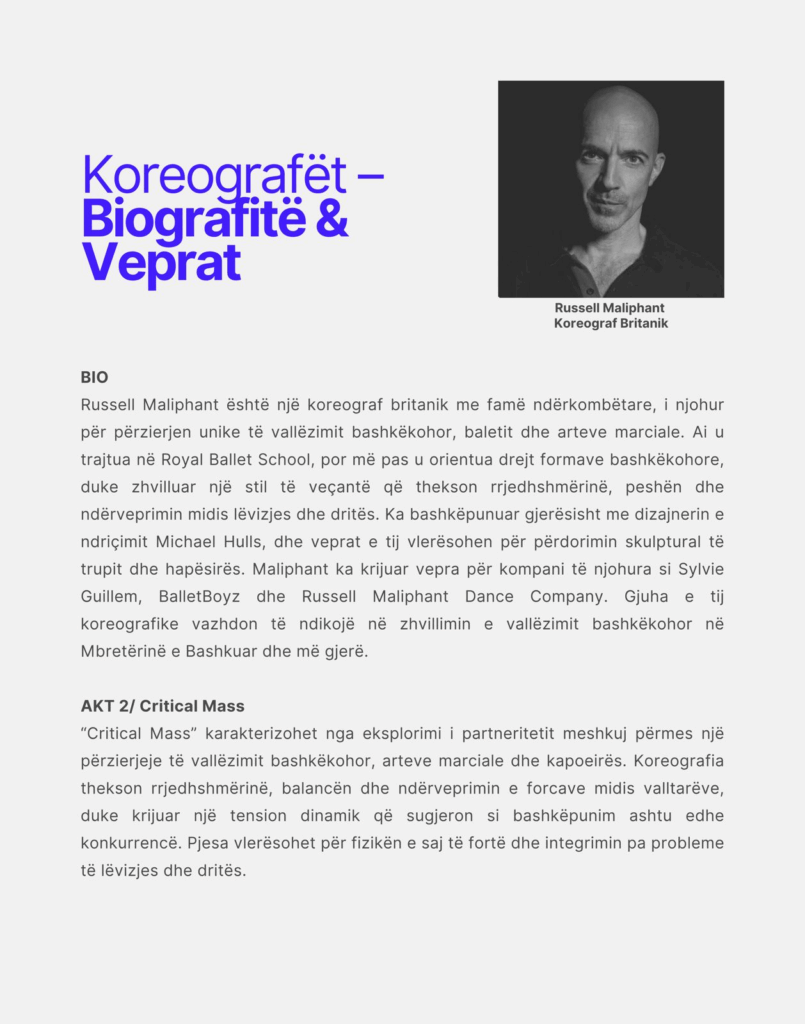 Kulmi i mbrëmjes pritet të jetë prezantimi për herë të parë në Shqipëri i veprës “Critical Mass” nga koreografi britanik me famë ndërkombëtare Russell Maliphant, një krijim i ftuar nga Lyon Ballet Opera dhe i sjellë në bashkëpunim të drejtpërdrejtë me Edi Blloshmin. Kjo vepër, e përshkuar nga tensioni koreografik dhe kërkimi estetik, pritet të jetë një eksperiencë që sfidon kufijtë tradicionalë të performancës në hapësira historike.
