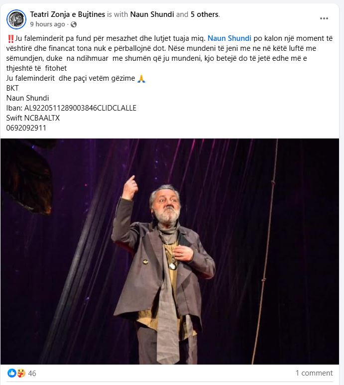 Artisti është dërguar për trajtim të specializuar në një spital në Francë, por kostot e larta financiare kanë detyruar familjarët që të kërkojnë ndihmë. Në një deklaratë, të publikuar nga Teatri Zonja e Bujtinës, është vënë në dispozicion një numër llogarie bankare për të kontribuuar.