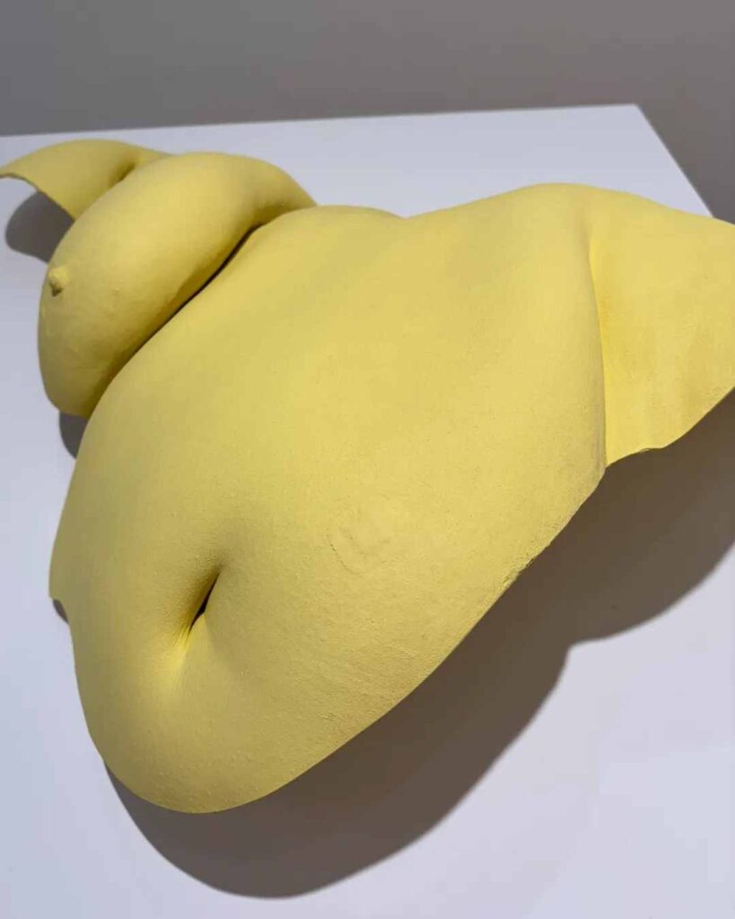 Kur hap dyert e galerisë, jam gati të refuzoj idetë që kam përvetësuar që nga dita kur interneti i tha vetes sime 10-vjeçare çfarë ishte “thigh gap”-i dhe pse duhej ta kisha. Në hapësirën e bardhë të galerisë më godasin ngjyrat e ndezura të veprave, forma trupi prej silikoni që Japanwala i ka shndërruar në skulptura të fuqishme. Kur e takoj në katin e poshtëm, ngrohtësia e pranisë së saj fillon të zbusë tensionin në trupin tim. Nervat më qetësohen nga atmosfera dhe nga rreshti i formave të thithave që ndodhen përreth. Frika që ndiej ndërsa përgatitemi së bashku është ajo e njëjtë me njerëzit që kanë qenë në vendin tim më parë, një frikë që Japanwala e njeh shumë mirë.