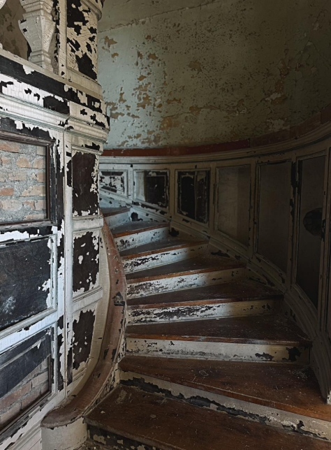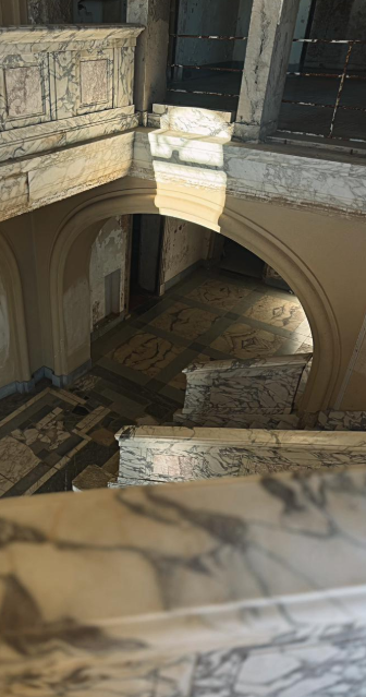 Ato dysheme druri që lëshojnë zhurmën karakteristike të dekadave, mermeri me damarë të gjelbër mbretëror, shkallët që përpijnë dritën, si të ishin vendosur aty me një llogari astronomike… gjithçka flet.