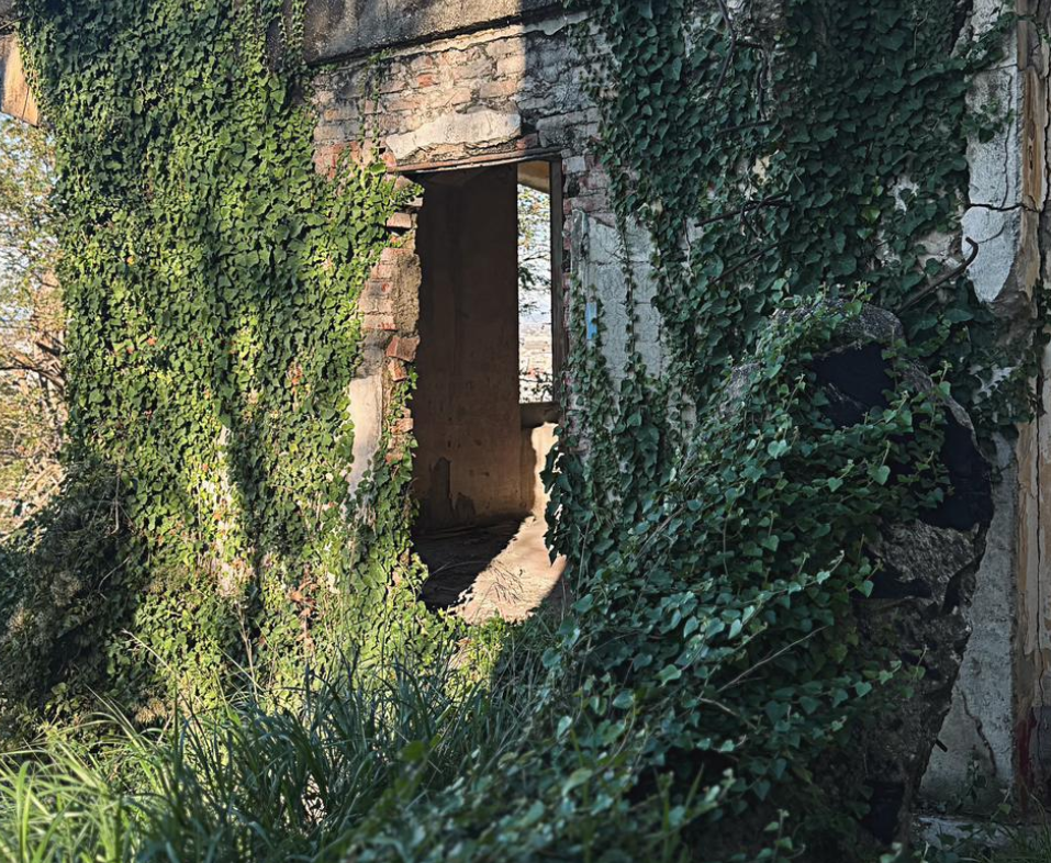 Diku, në zonën perëndimore të vilës, një godinë pa hyrje e pa dalje qëndron si një alegori e bukur e absurdit shqiptar, muret e saj janë mbyllur me tulla, por natyra ka marrë iniciativën, duke e veshur me bimë kacavjerrëse që bëjnë atë që nuk e bënë dot institucionet, i japin pamjen e dinjitetit që meriton.