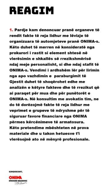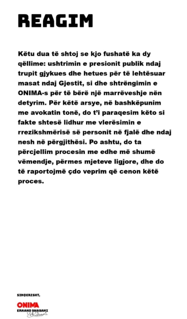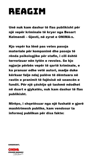 Situata mes kompanisë muzikore Onima dhe artistit kosovar Besart Kelmendi, i njohur me emrin artistik Gjesti, ka hyrë në një fazë të re përplasjesh publike, pasi pronari i kompanisë, Erkand Shabani, ka reaguar për herë të parë në mënyrë të detajuar lidhur me ngjarjen që sipas tij ndodhi në zyrat e kompanisë.
