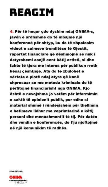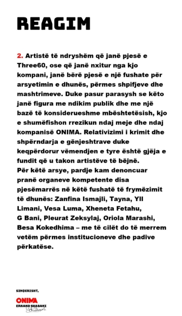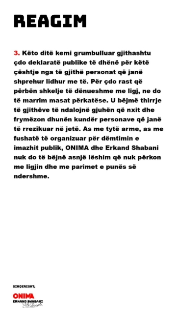 Ndërsa debati publik vazhdon të zgjerohet në rrjete sociale dhe media, përplasja mes kompanisë Onima dhe artistit Besart Kelmendi tashmë është në shqyrtim nga institucionet e drejtësisë, të cilat pritet të vendosin mbi përgjegjësitë ligjore dhe zhvillimet e mëtejshme të rastit.