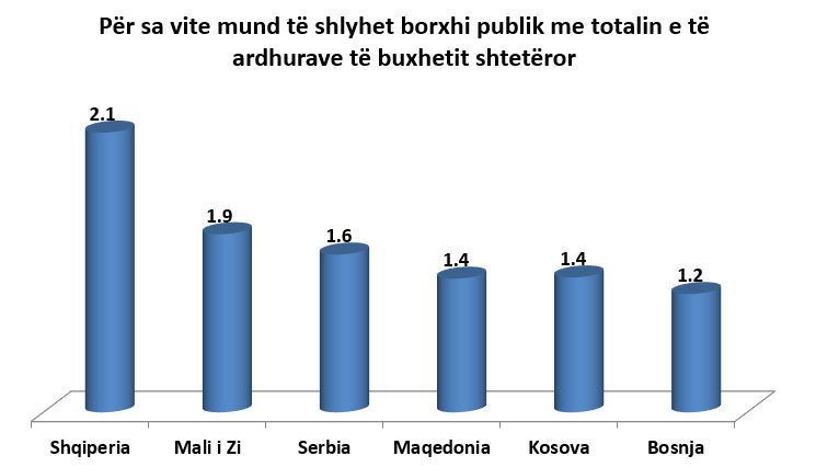 Ky tregues i yni është më i larti ndër vendet e Ballkanit Jugperëndimor (shihni grafikun më poshtë). Gjë që tregon se në rajonin tonë, Shqipëria ka aftësinë më të vogël për shlyerjen e borxhit publik. Kurse Bosnja, Kosova dhe Maqedonia kanë aftësinë më të madhe për shlyerjen e borxhit të tyre publik.